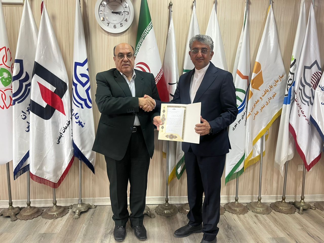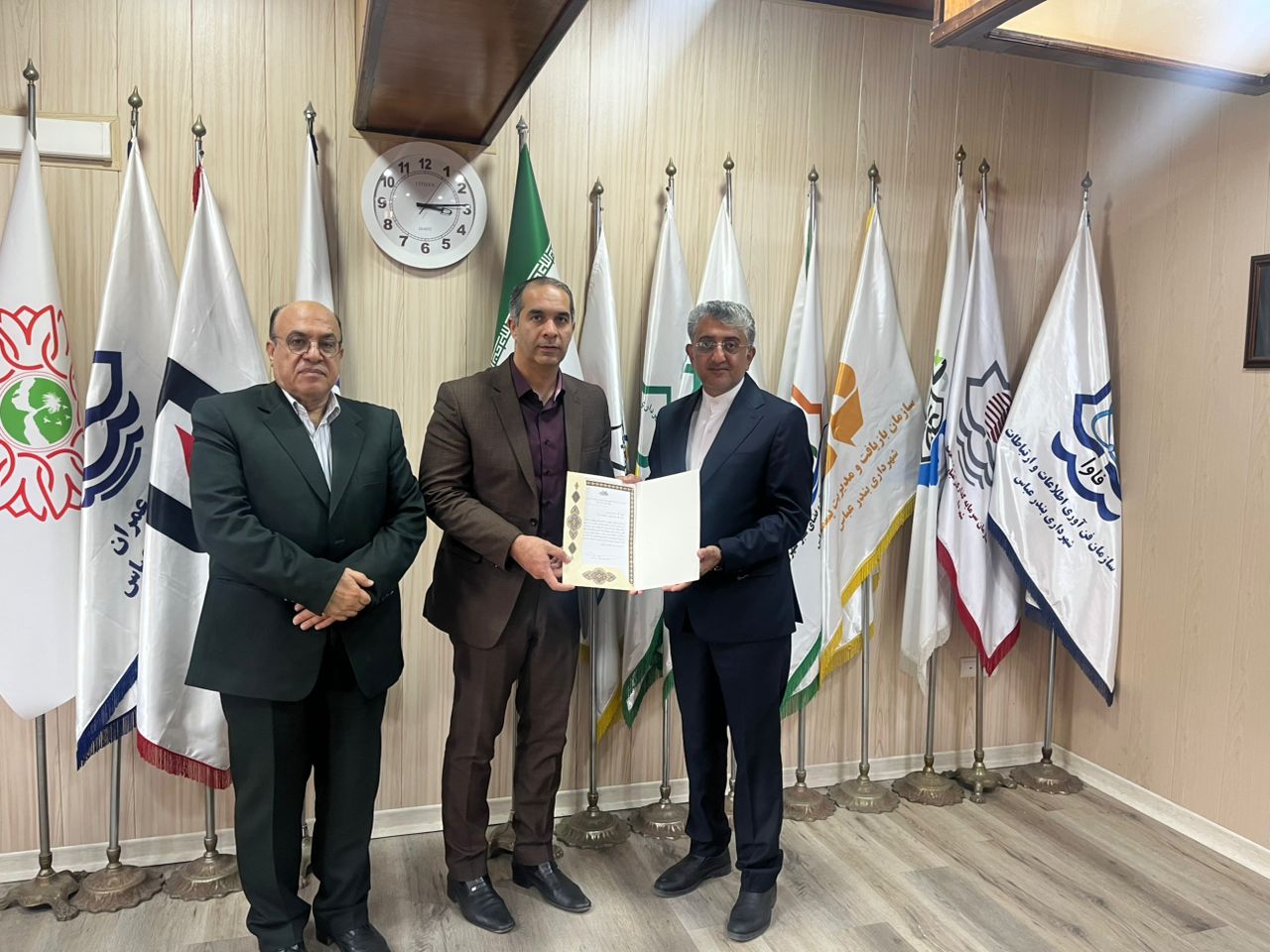 در پایان، شهردار بندرعباس به رسم یادبود، حکم تقدیر و تشکر به دکتر پوریا رئیس فدراسیون و فرشاد نصرتی دبیر فدراسیون اهدا کرد.